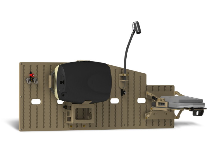 Ferno Military Systems creates wall-mounted systems for specific vehicle types. This design utilizes Ferno-Track rail components, allowing vehicle operators to customize the arrangement of hooks and medical equipment to meet immediate transportation needs.