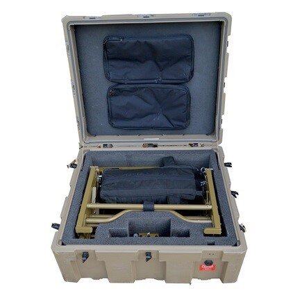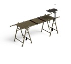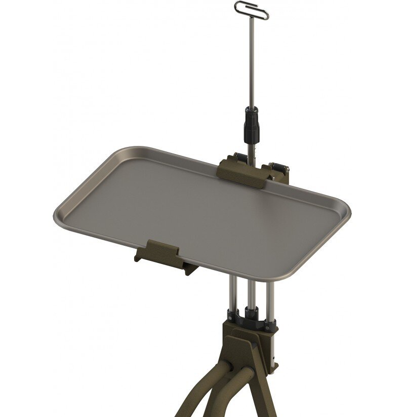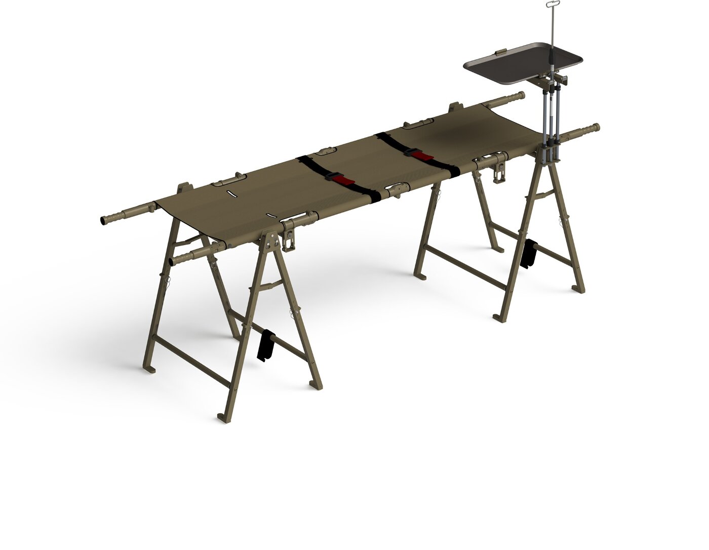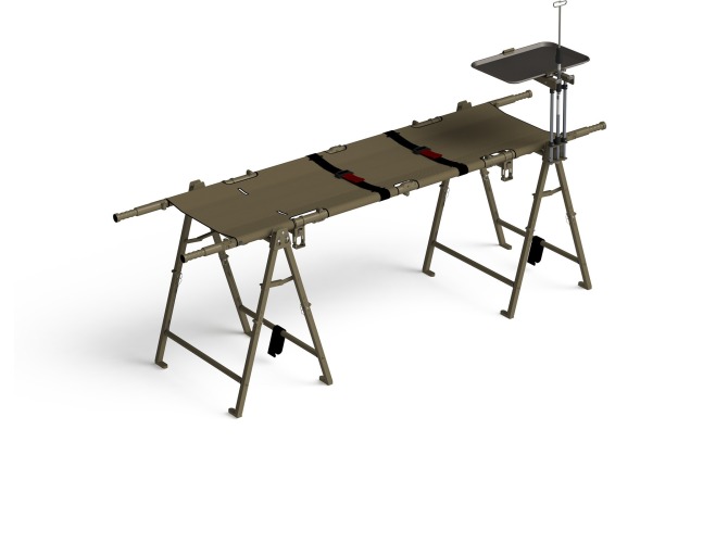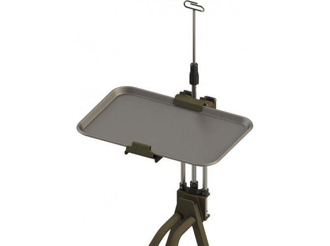 The simple and functional design of the supports allows for quick deployment and preparation to receive the patient. The folding system makes it easy to compactly fold the supports into a suitcase or backpack, achieving small transport dimensions. A wide range of accessories allows you to obtain the function of a full treatment table, facilitating work with the injured person. These include: an IV pole, an accessory holder, and a treatment tray mounted to it. It is possible to mount up to 4 such sets to one set of stretcher supports. The whole is made in aviation technology on quick connectors.