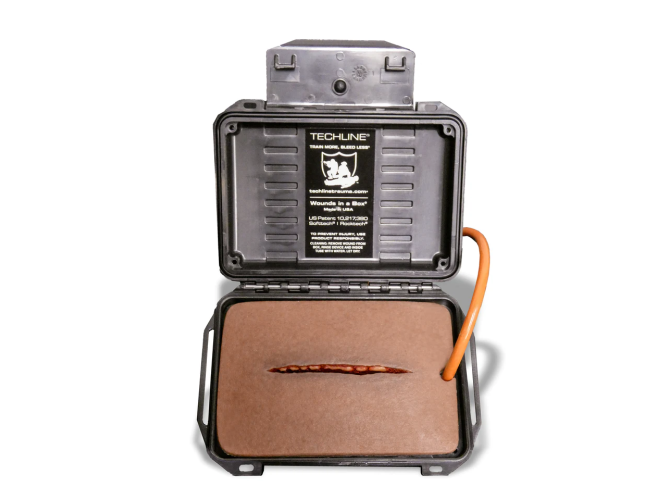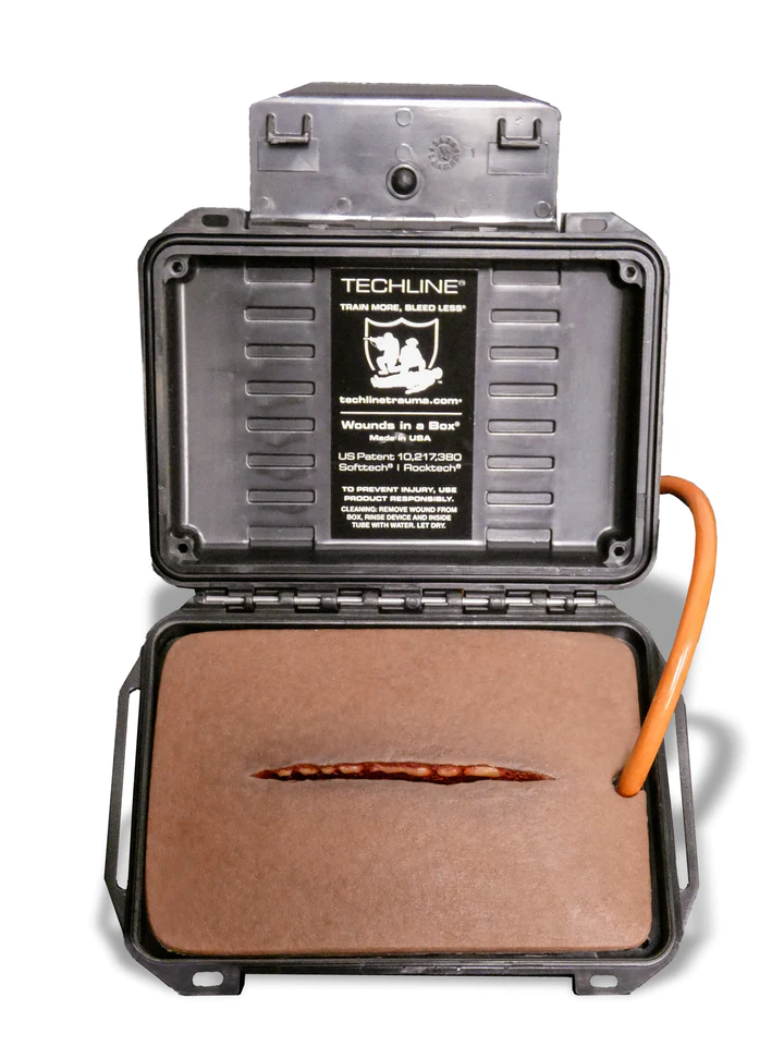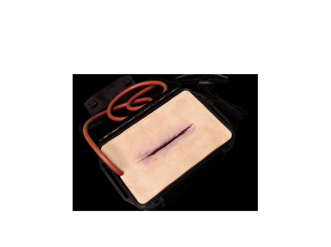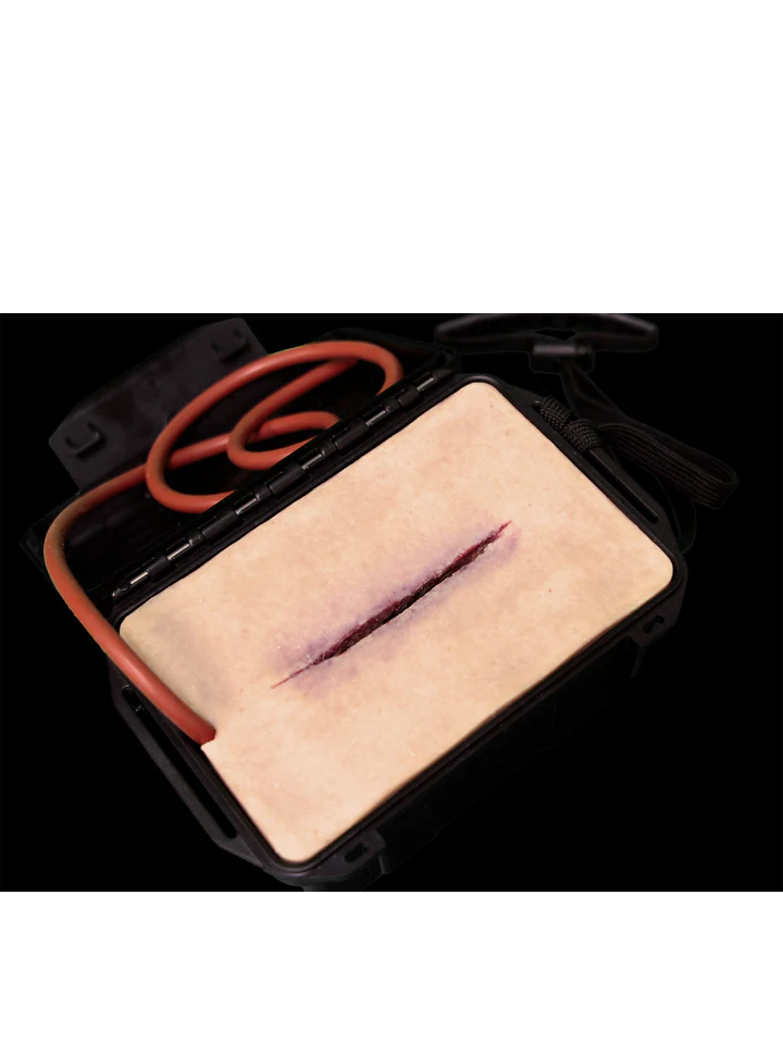 The Laceration in a Box™ task trainer simulates deep soft tissue lacerations and is used to instruct students in proper wound packing techniques.