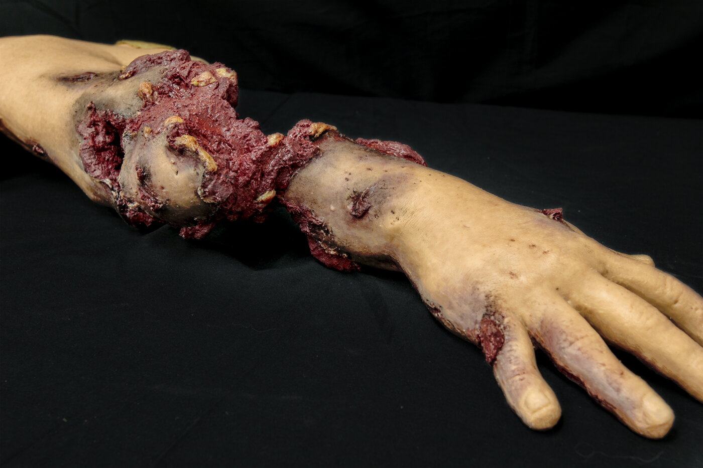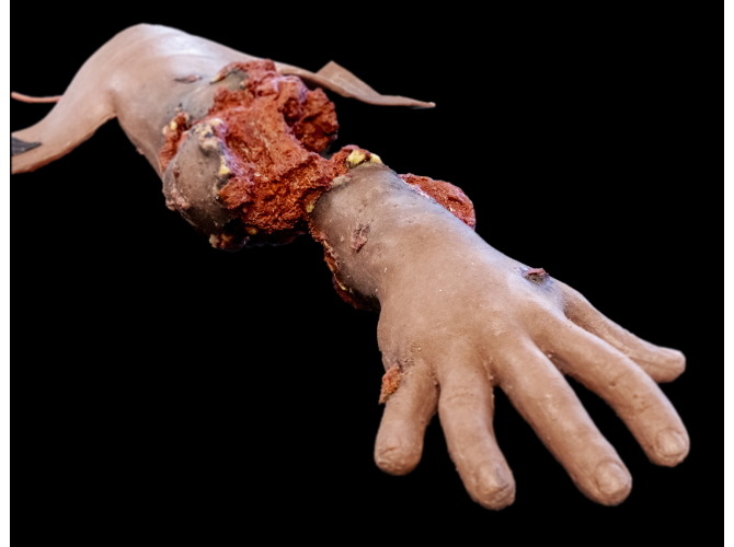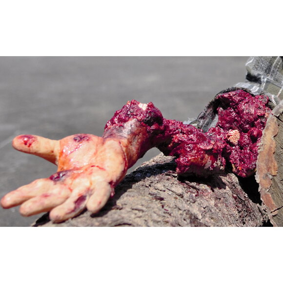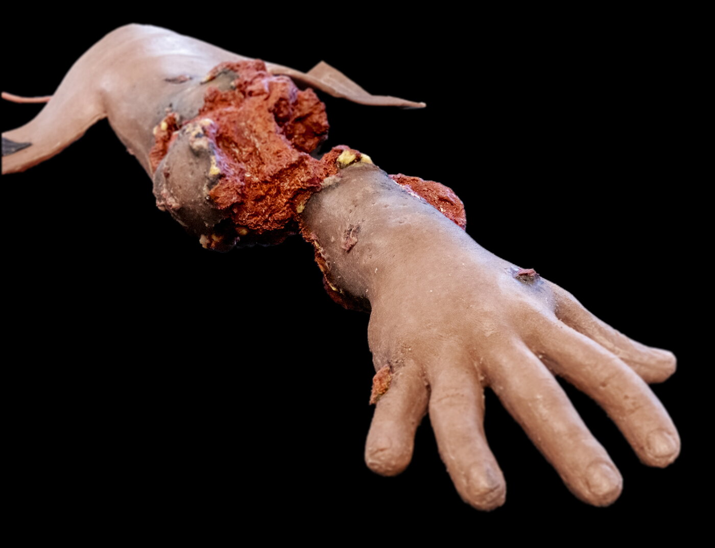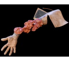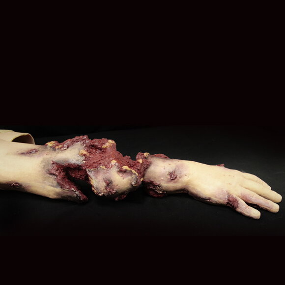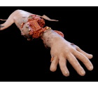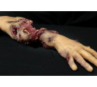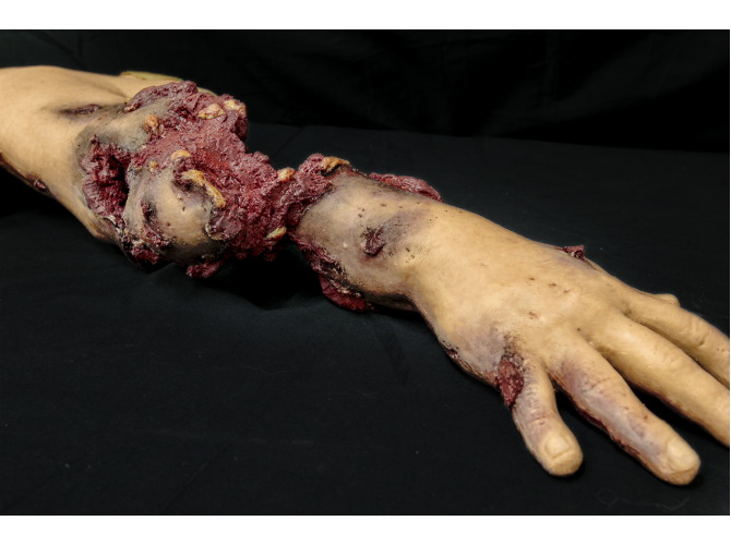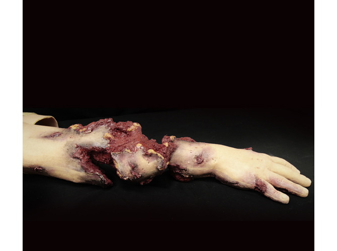 Wound simulation depicting an arm amputation, exposing bone, muscle, fat, and tendons. Wraps around an actor or mannequin, securing with Velcro. Integrated tubing allows for simulated blood flow. Bleeding system included. Patented design utilizing SOFTTECH® and ROCKTECH® materials for realism.