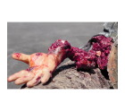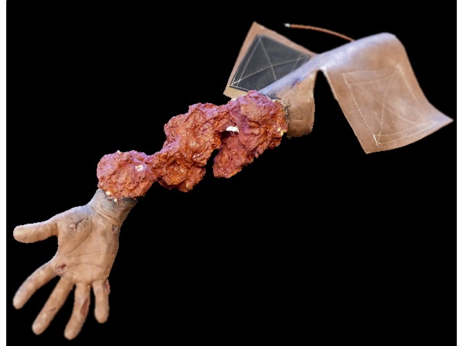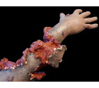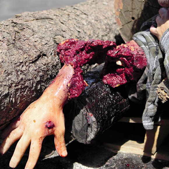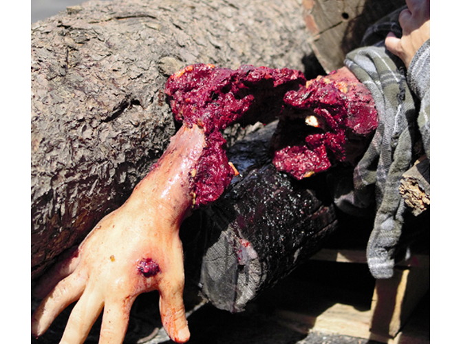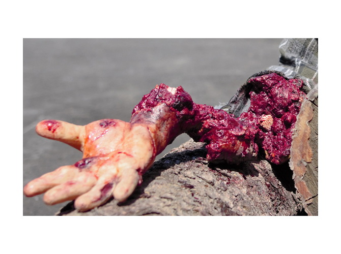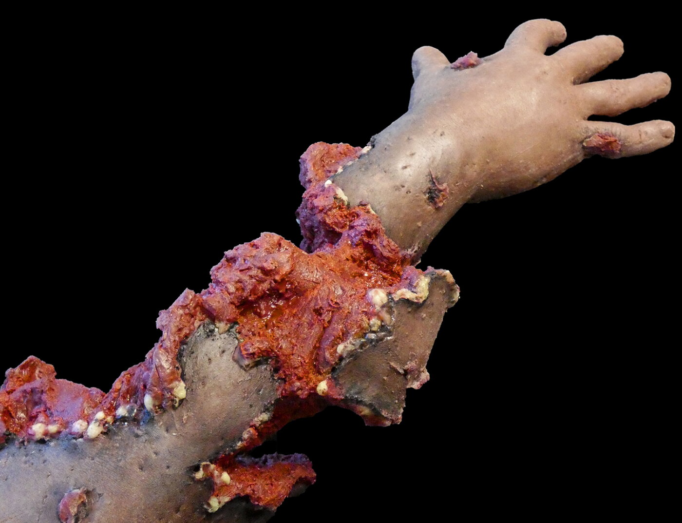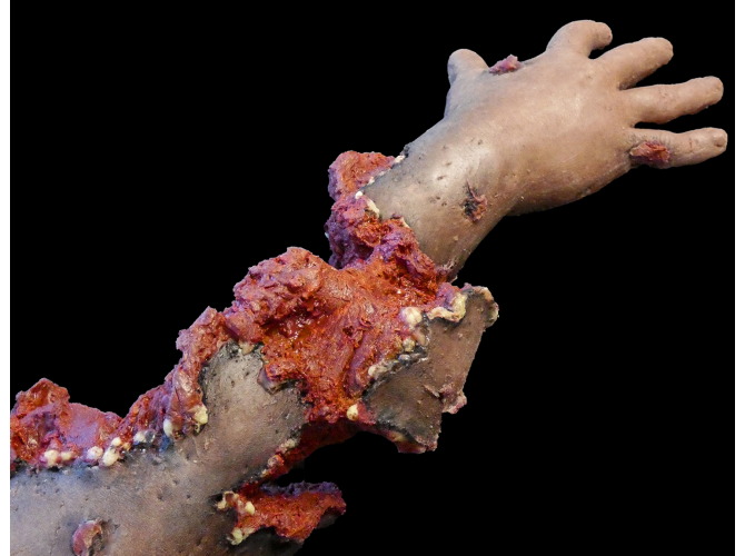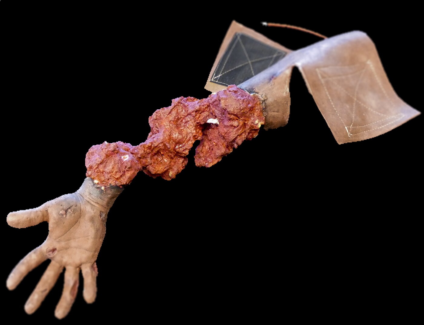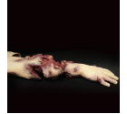 Wound simulation depicting an arm amputation, exposing bone, muscle, fat, and tendons. Wraps around an actor or mannequin, securing with Velcro. Integrated tubing allows for simulated blood flow. Bleeding system included. Patented design utilizing SOFTTECH® and ROCKTECH® materials for realism.