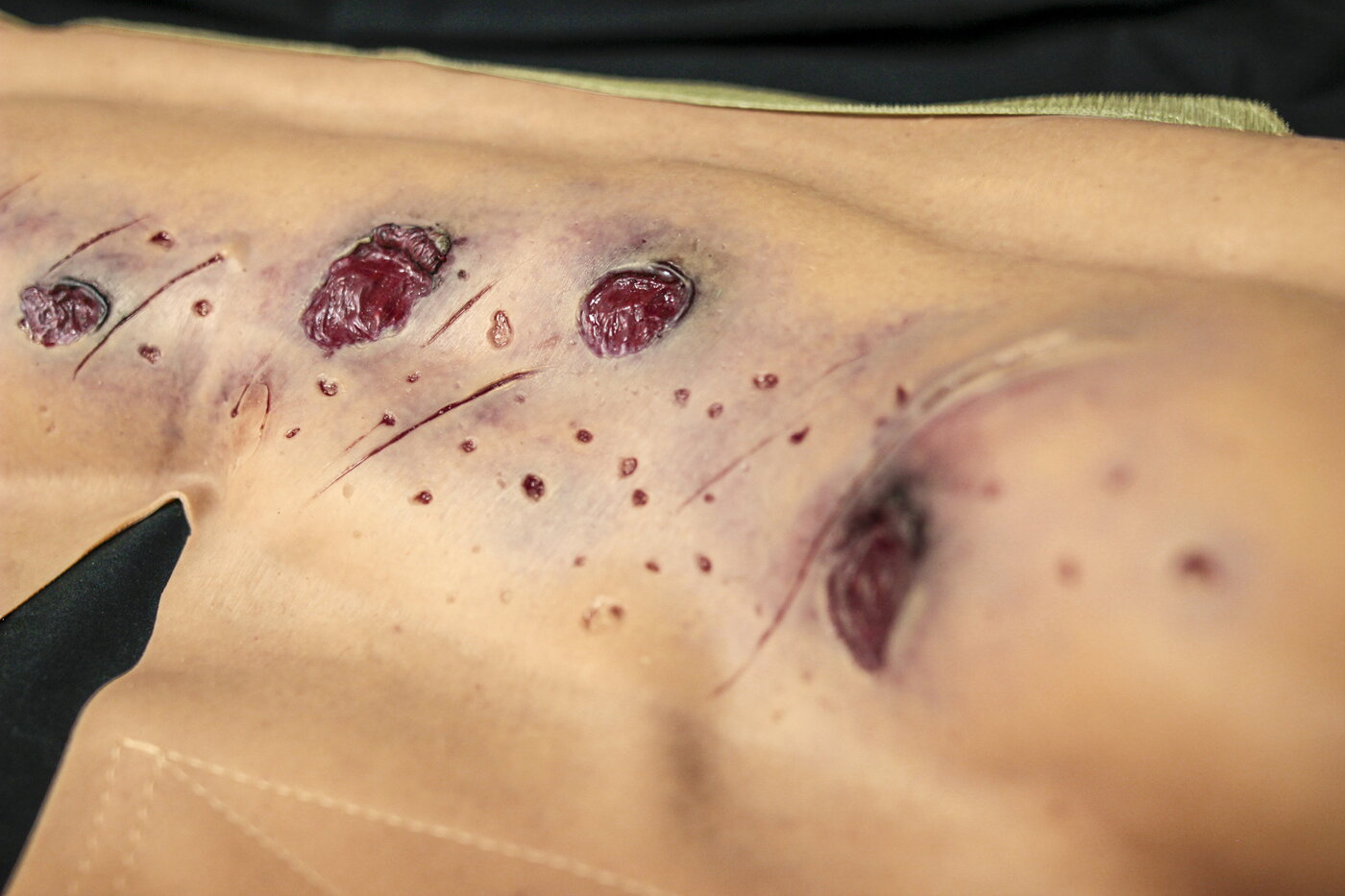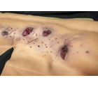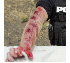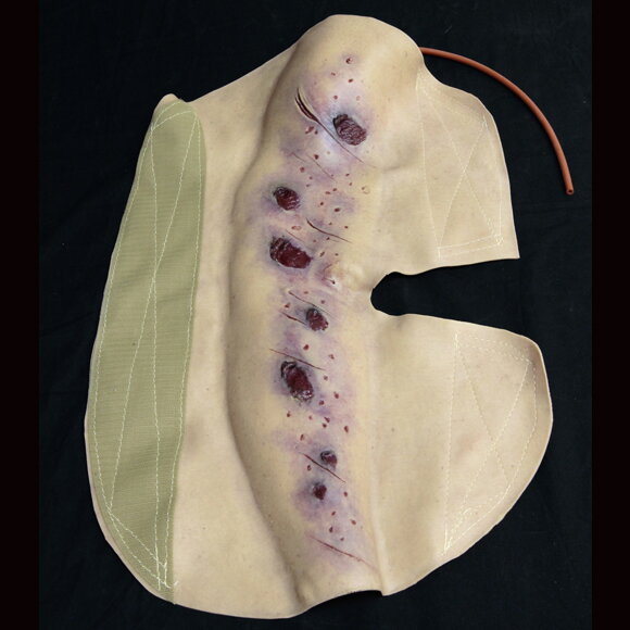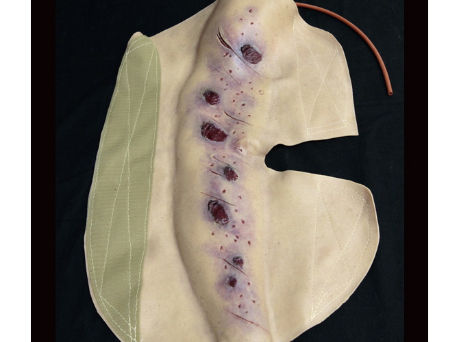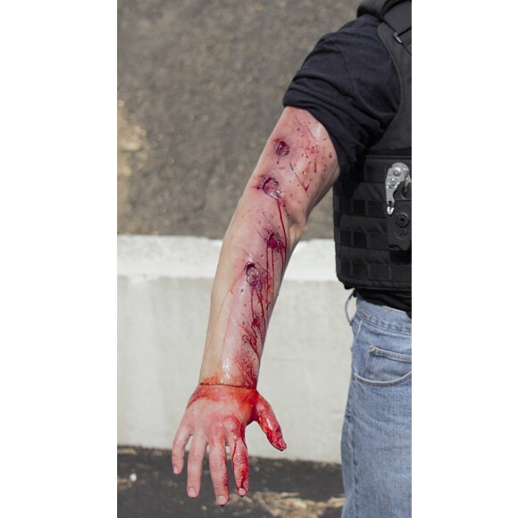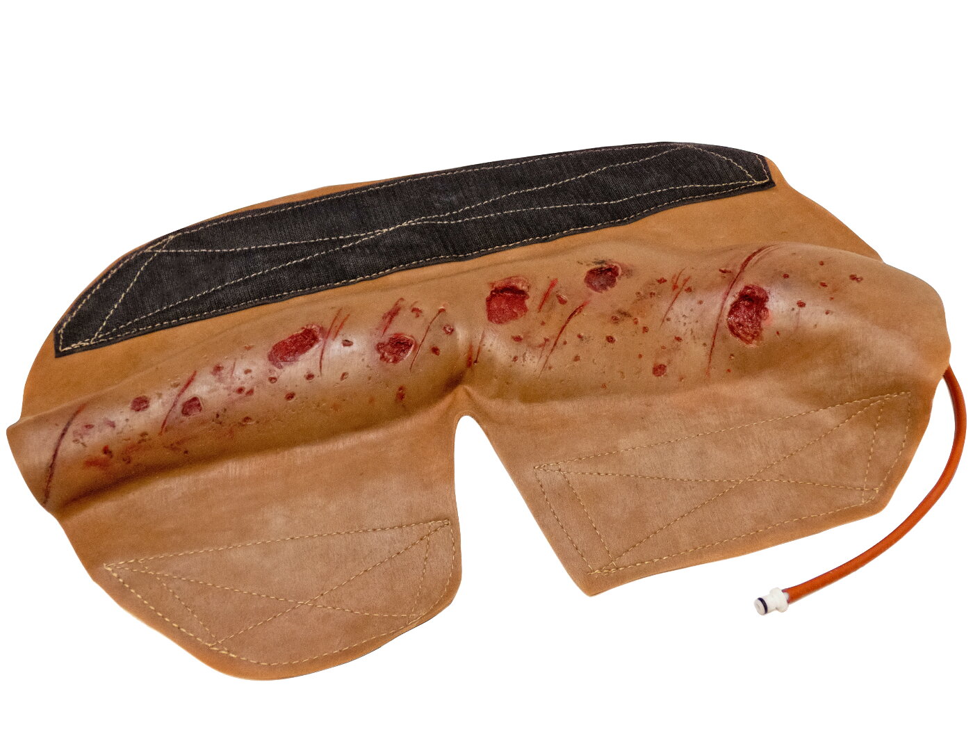 A simulator depicting a right arm superficially lacerated by shrapnel. The bleeding system is designed to allow blood to flow from multiple points simultaneously. The model creates a sleeve that wraps around the actor's or mannequin's arm and is secured with Velcro straps. The integrated bleeding system allows for easy simulation of blood flow.