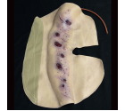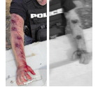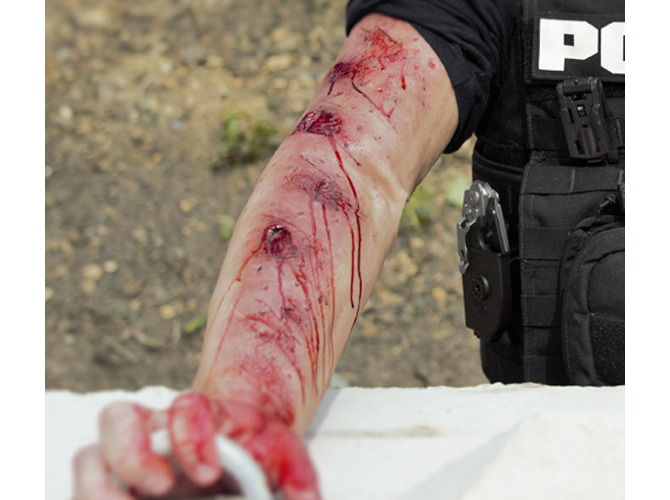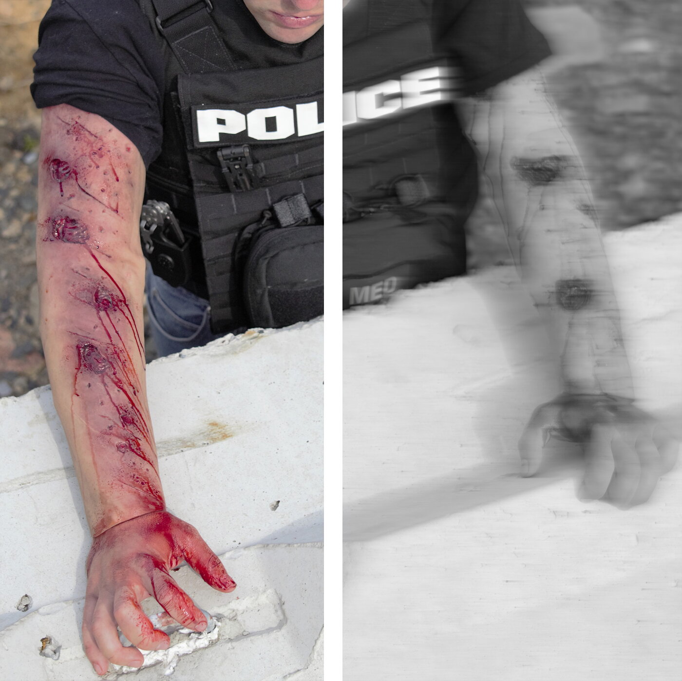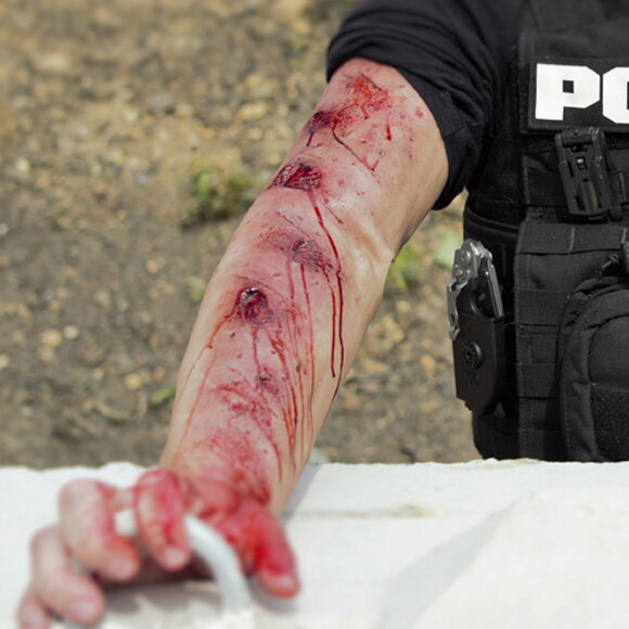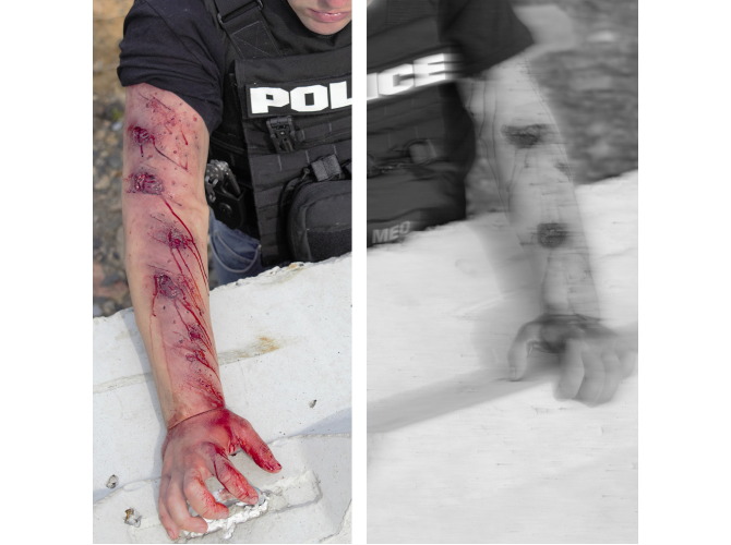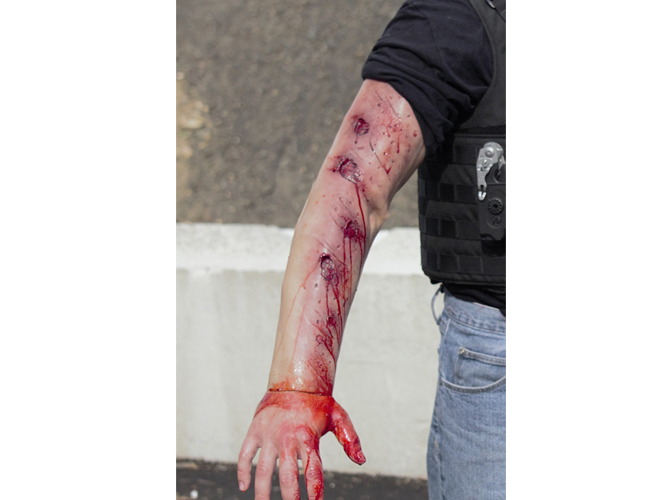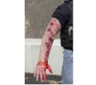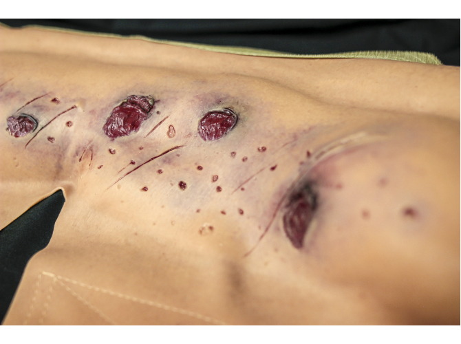 A simulator depicting a right arm superficially lacerated by shrapnel. The bleeding system is designed to allow blood to flow from multiple points simultaneously. The model creates a sleeve that wraps around the actor's or mannequin's arm and is secured with Velcro straps. The integrated bleeding system allows for easy simulation of blood flow.
