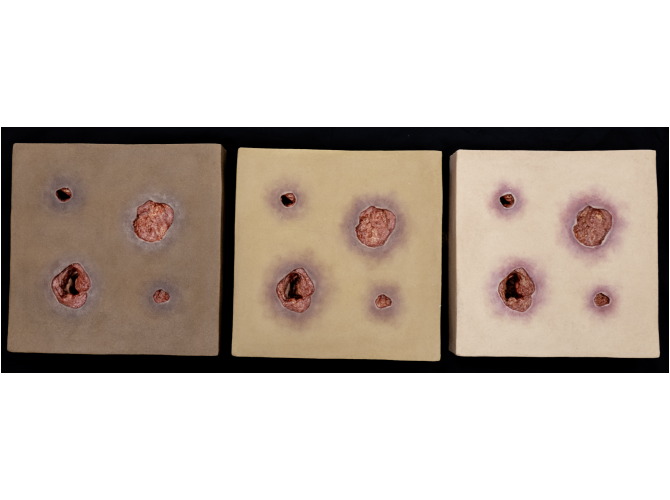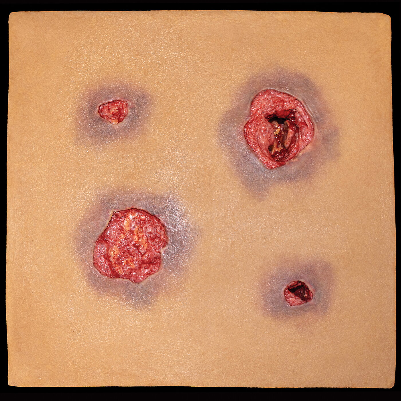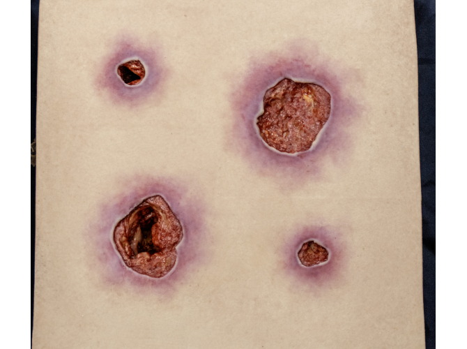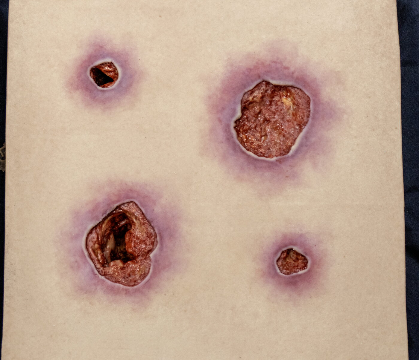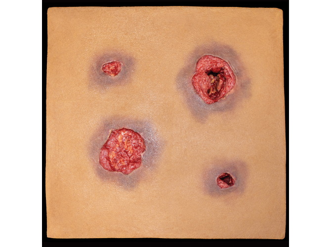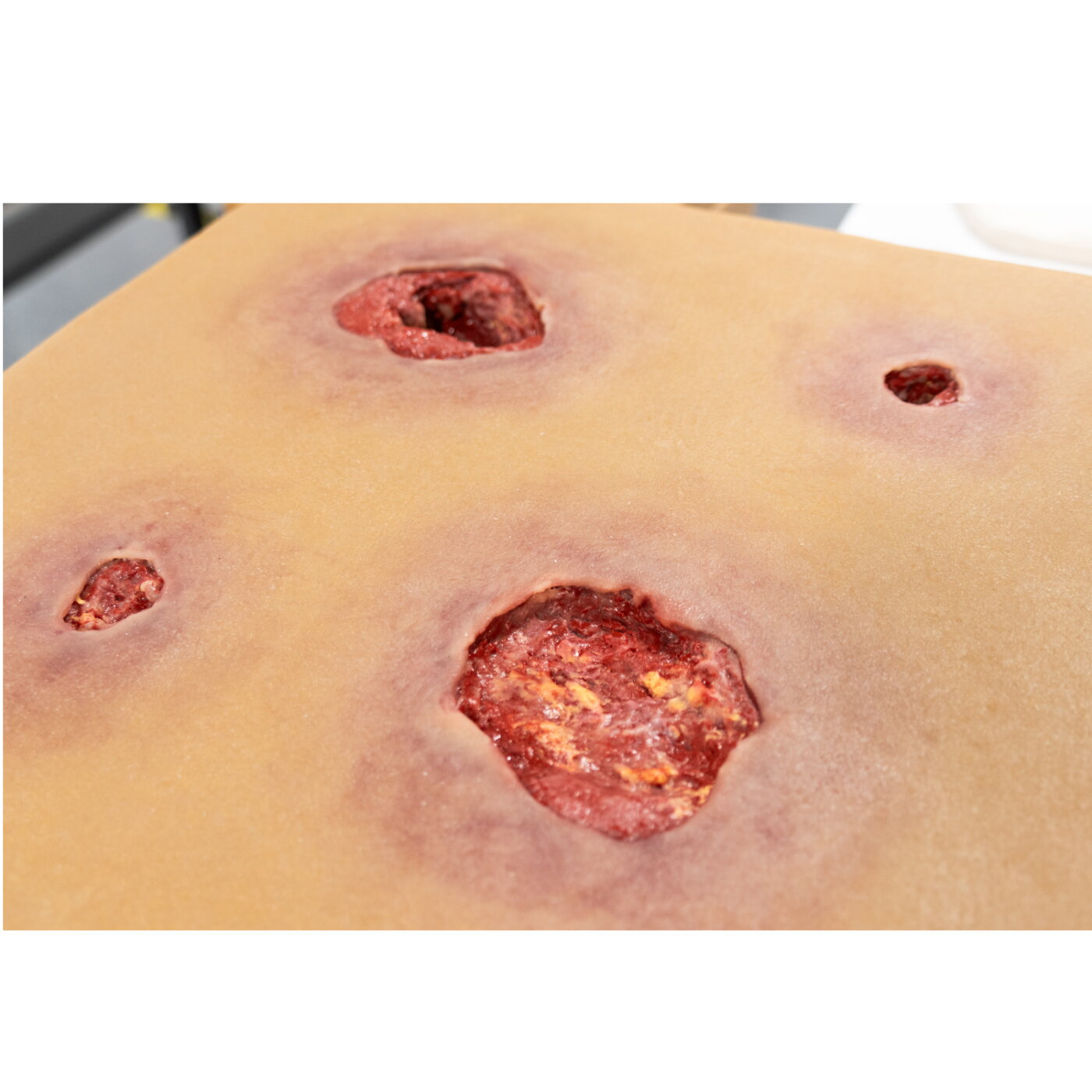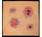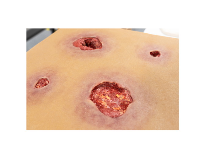 The training mat with 4 wounds consists of four different pressure ulcers that vary in diameter and depth, enabling the identification of individual stages and the selection of appropriate treatment options.