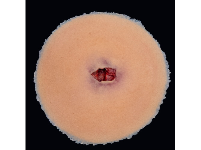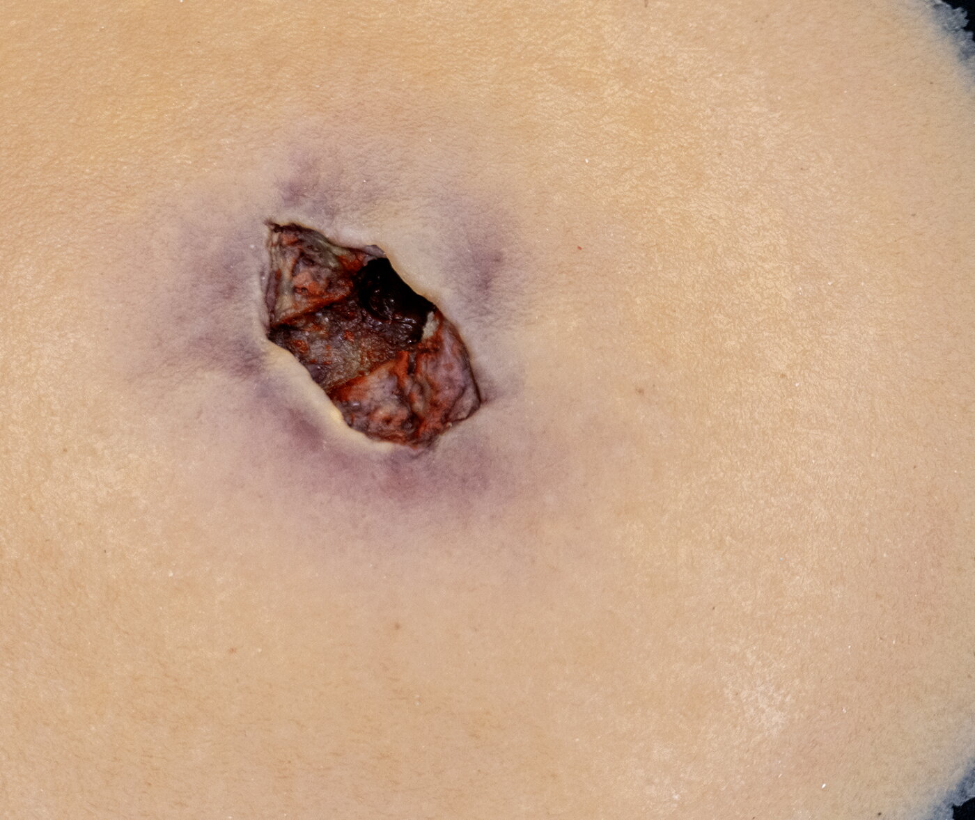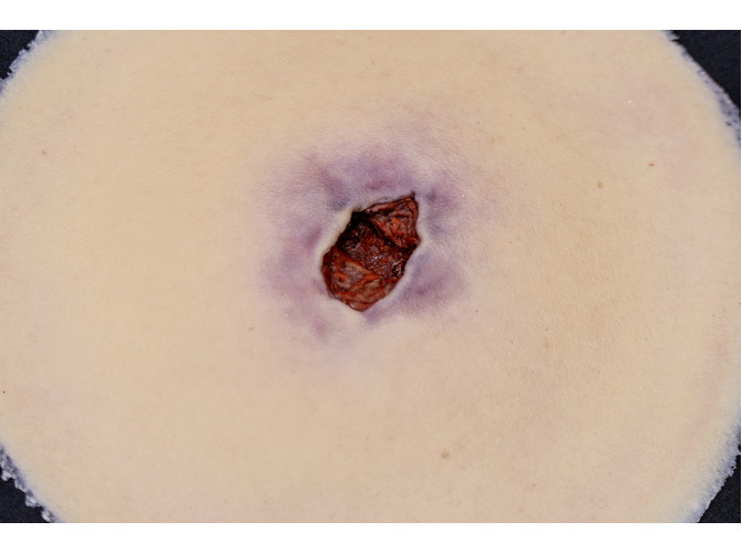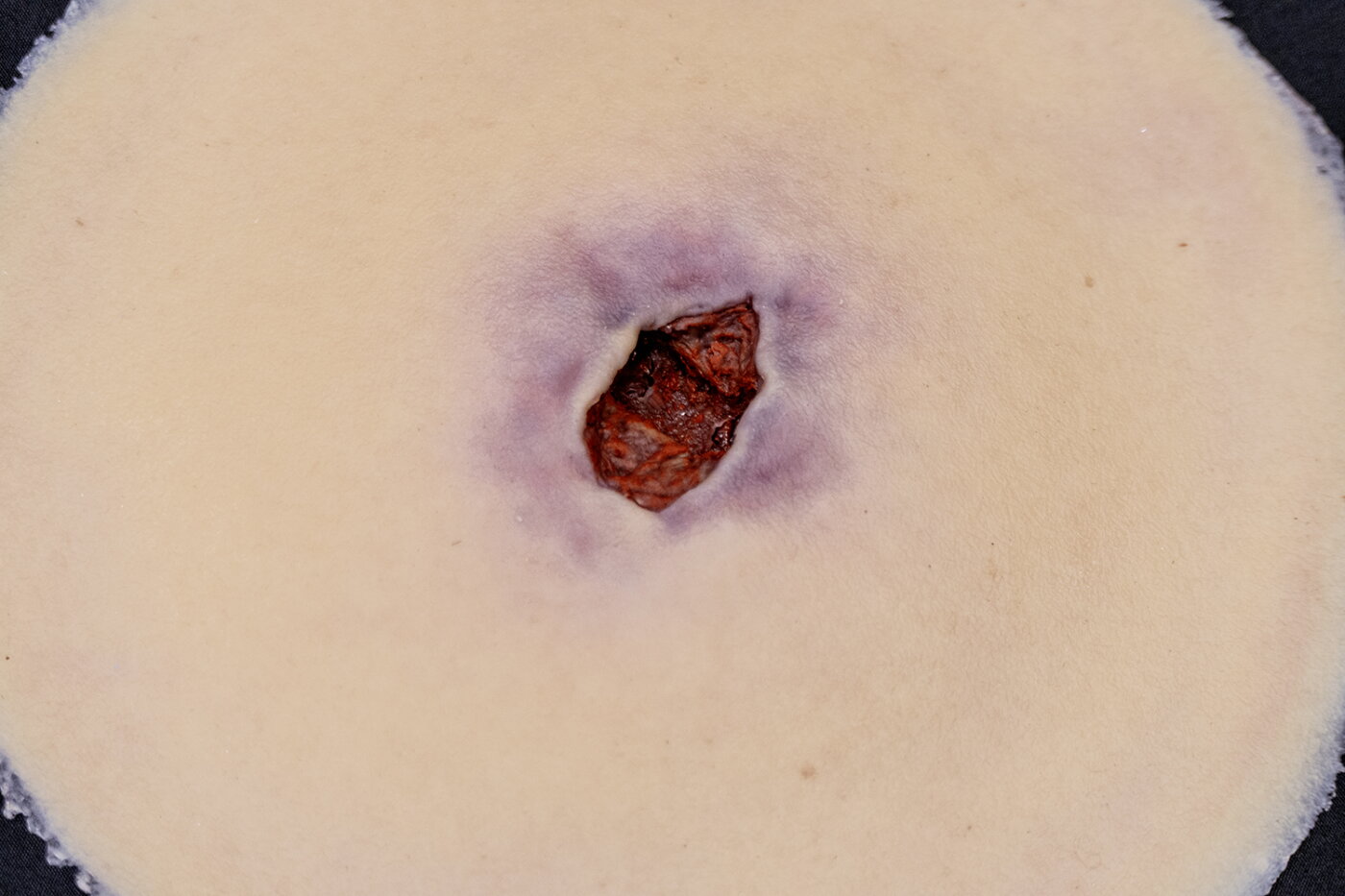 A tunneling wound replica features an open wound with tracts that extend into subcutaneous or muscle tissue, forming a so-called tunnel.