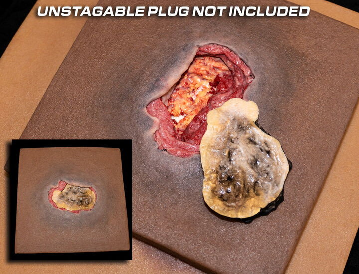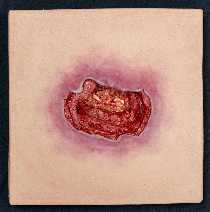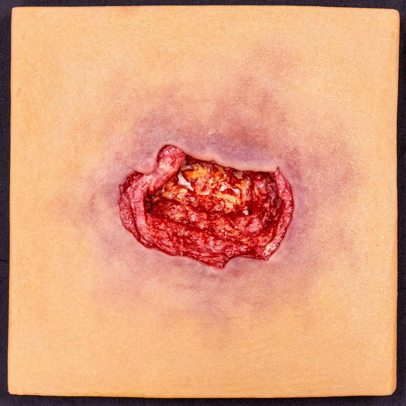 Treningowy model odleżyny stopnia IV przedstawia czwarty etap rozwoju odleżyny.