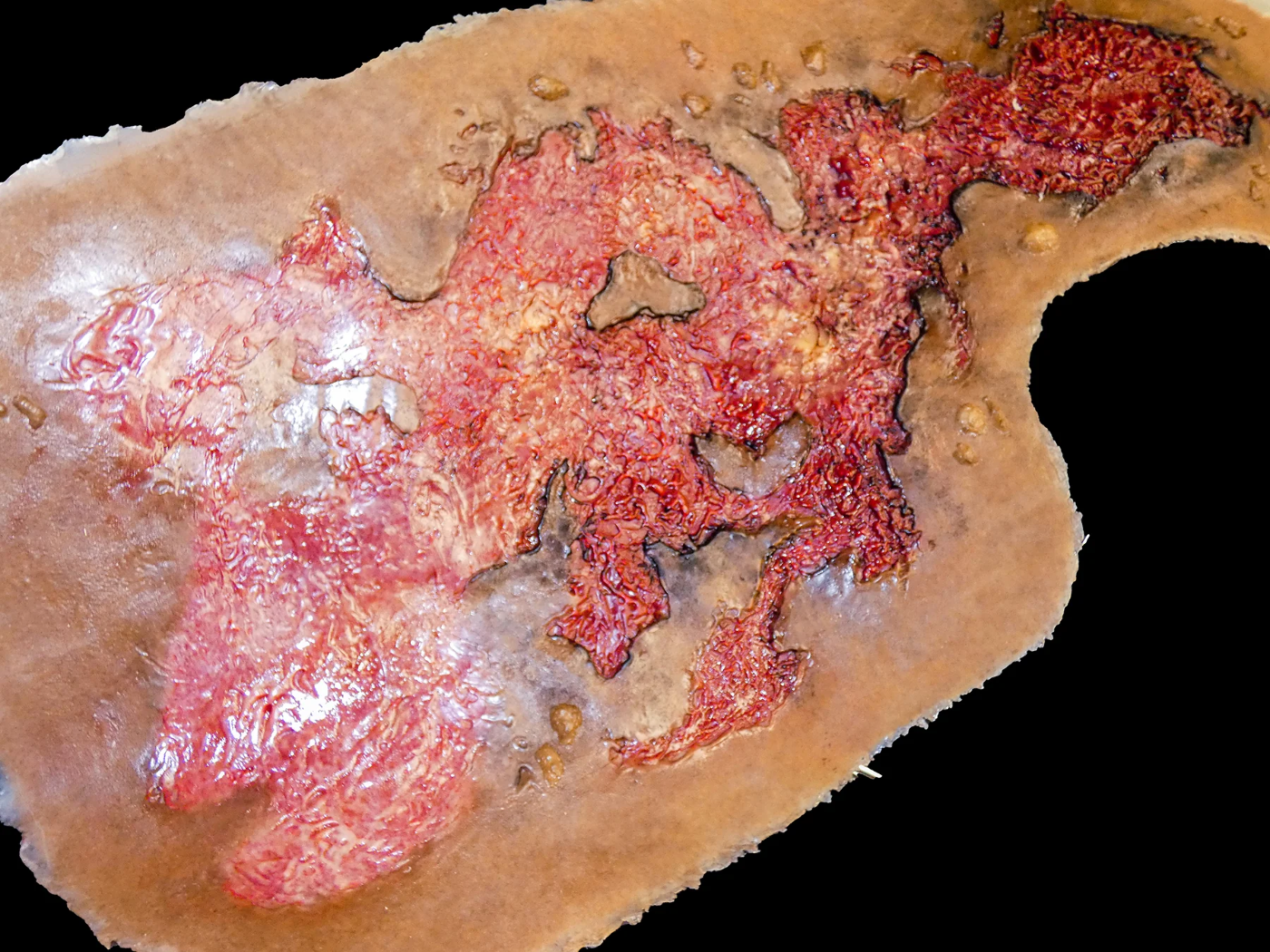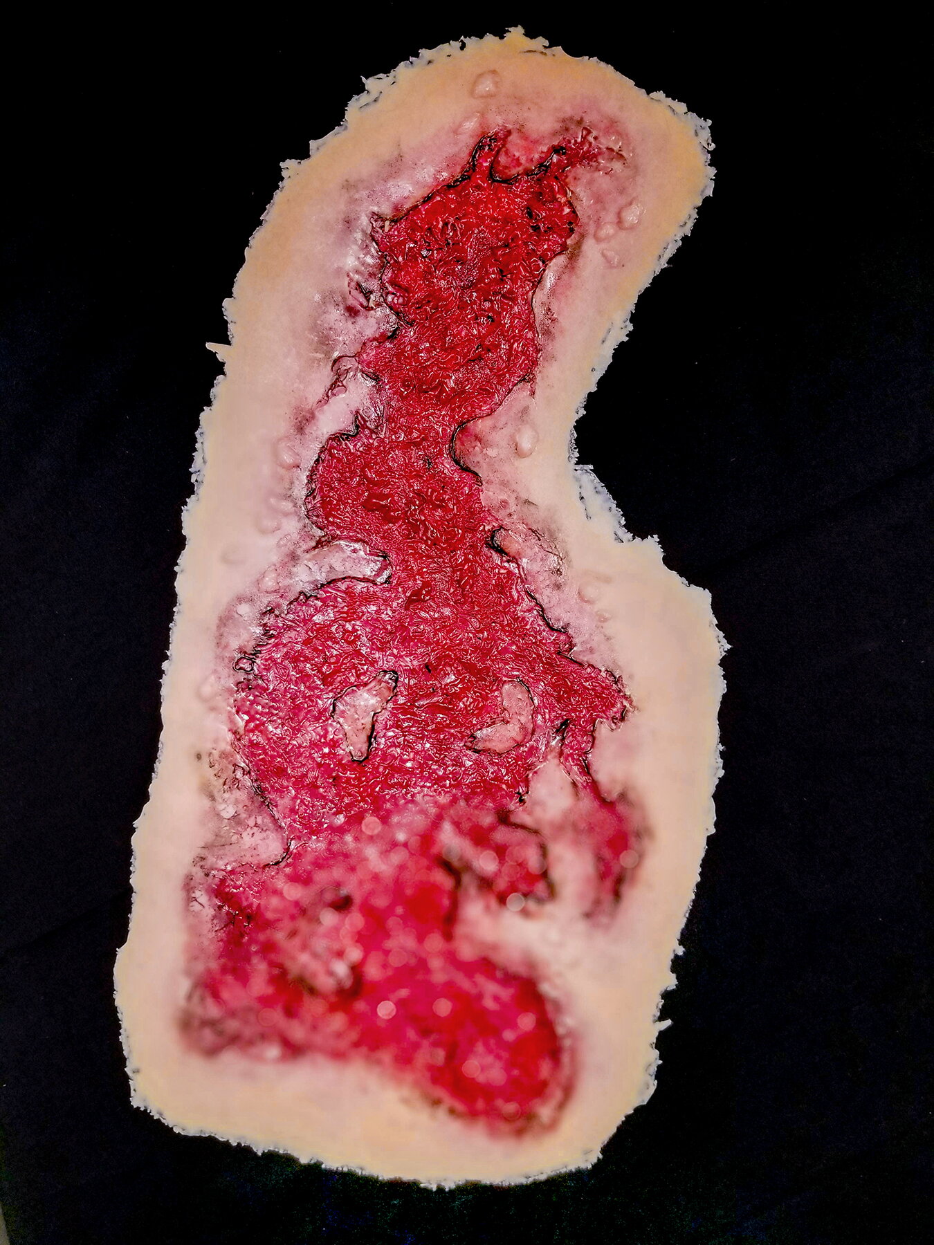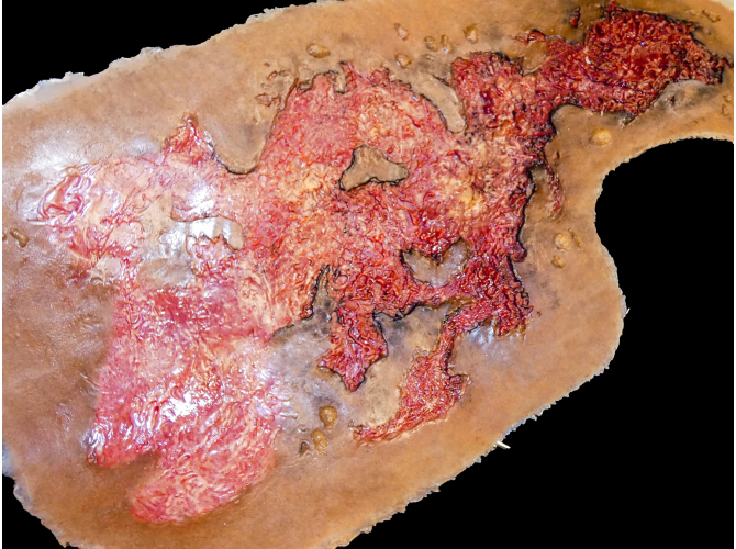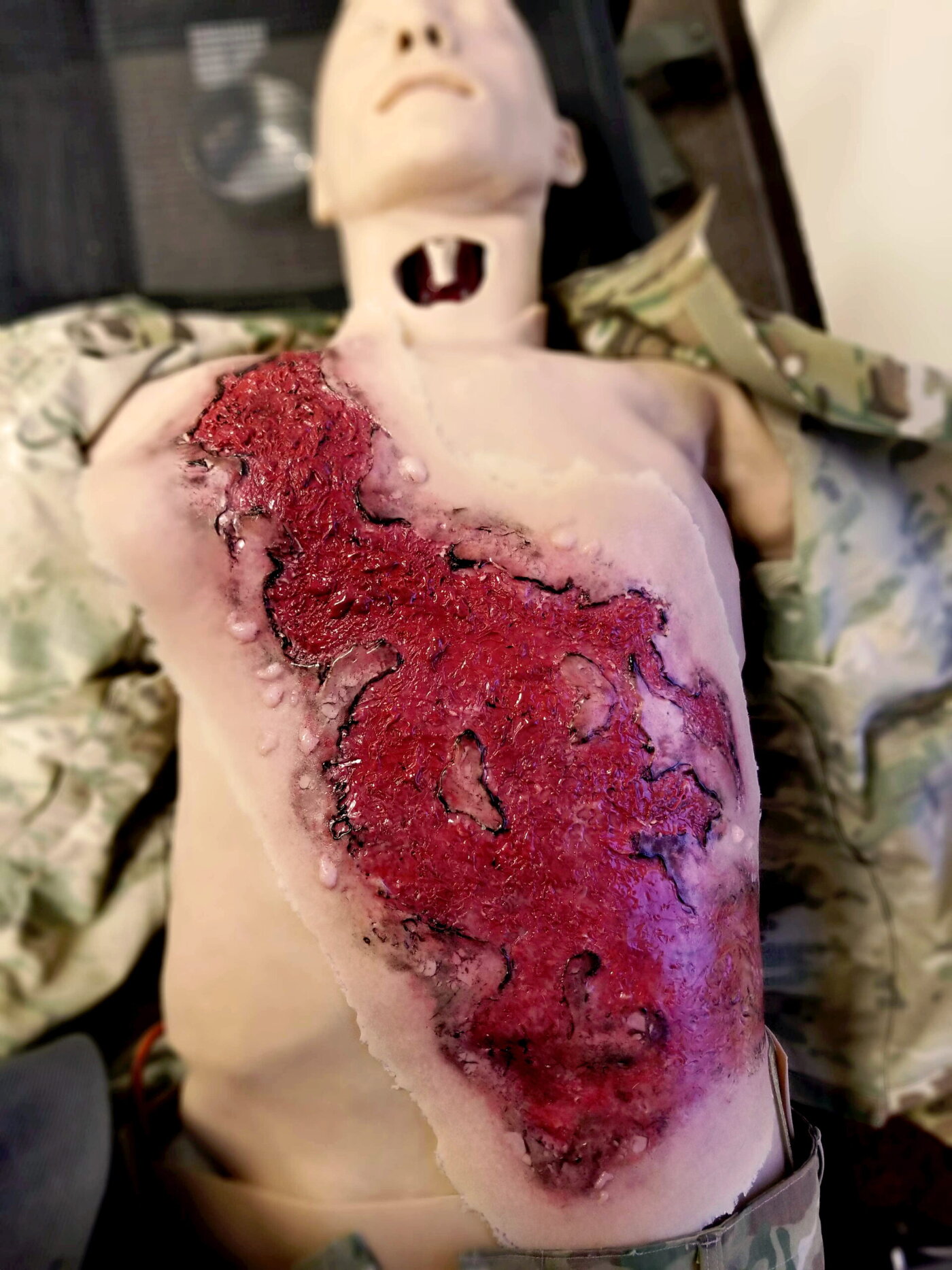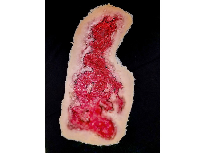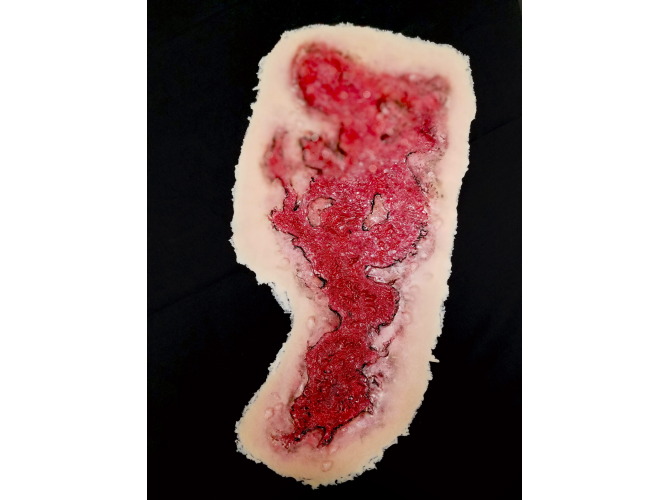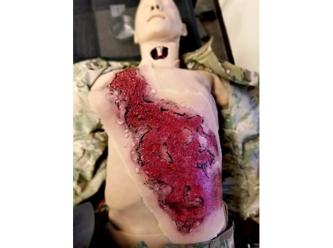 Techline Trauma SW018 – 3rd Degree Thermal Chest Burn to realistyczna symulacja oparzenia trzeciego stopnia na klatce piersiowej, przeznaczona do szkoleń z zakresu medycyny taktycznej, ratownictwa oraz pierwszej pomocy. Symulacja przedstawia głębokie uszkodzenie skóry i tkanek, charakterystyczne dla oparzeń trzeciego stopnia.