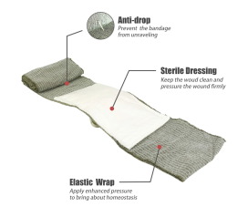 Opatrunek indywidualny typu izraelskiego, wykonany z bawełnianego bandaża elastycznego oraz nieprzywierającego podkładu chłonnego i plastikowych elementów umożliwiających zmianę kierunku bandażowania oraz uzyskanie dodatkowego ucisku na miejsce krwawienia.