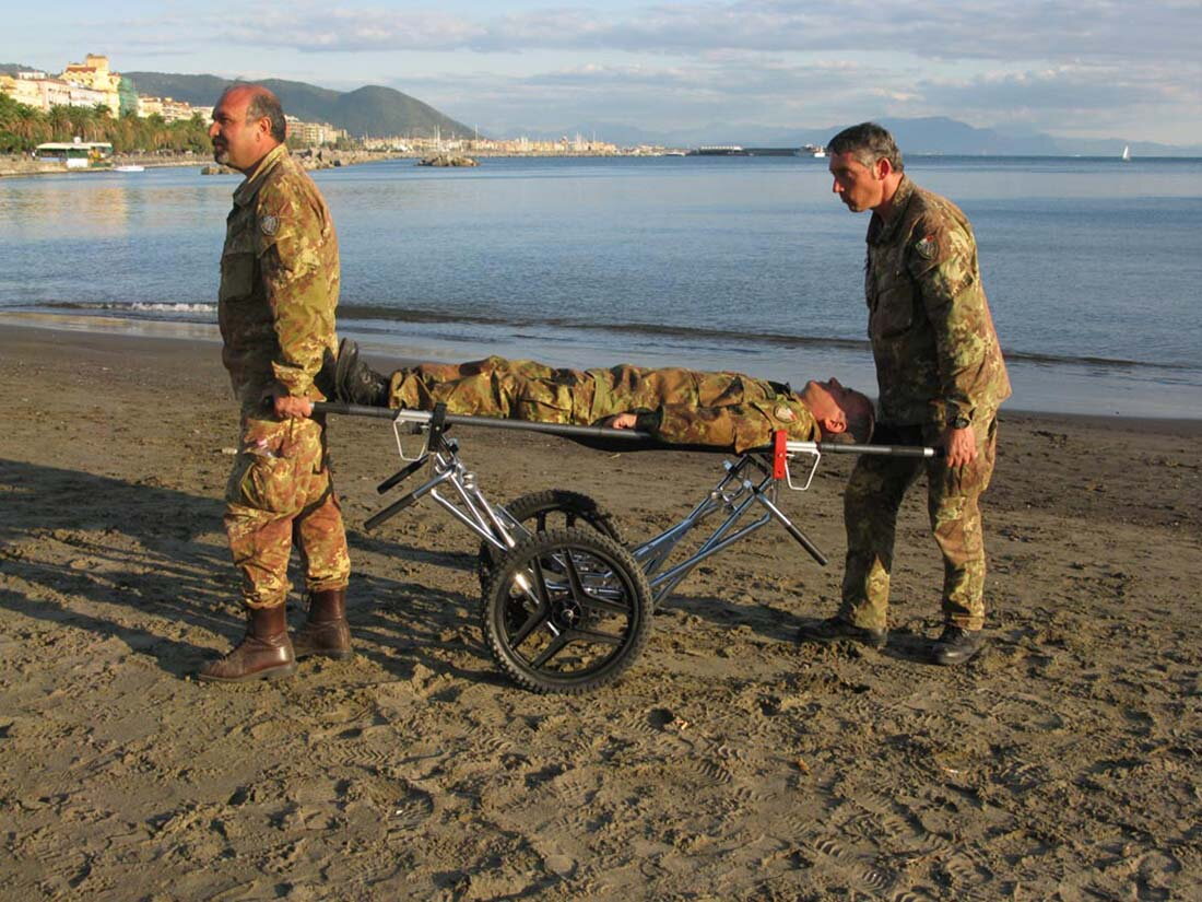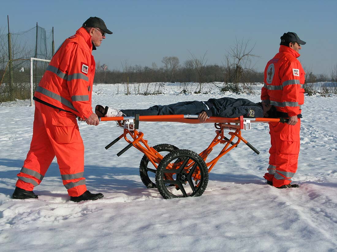 Transporter EL2000/EL3000 to lekkie, stabilne urządzenie, wyposażone w duże koła, umożliwiające transport, przewożenie rannych lub materiałów w różnych warunkach terenowych, na różnych typach noszy.