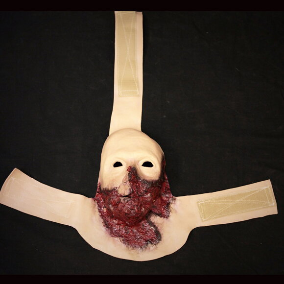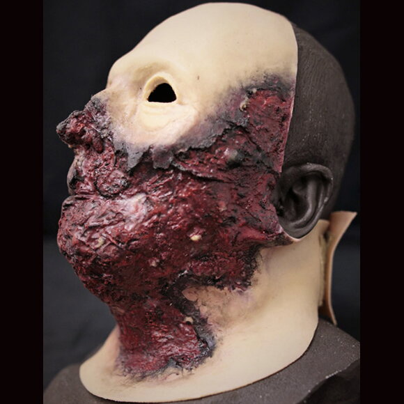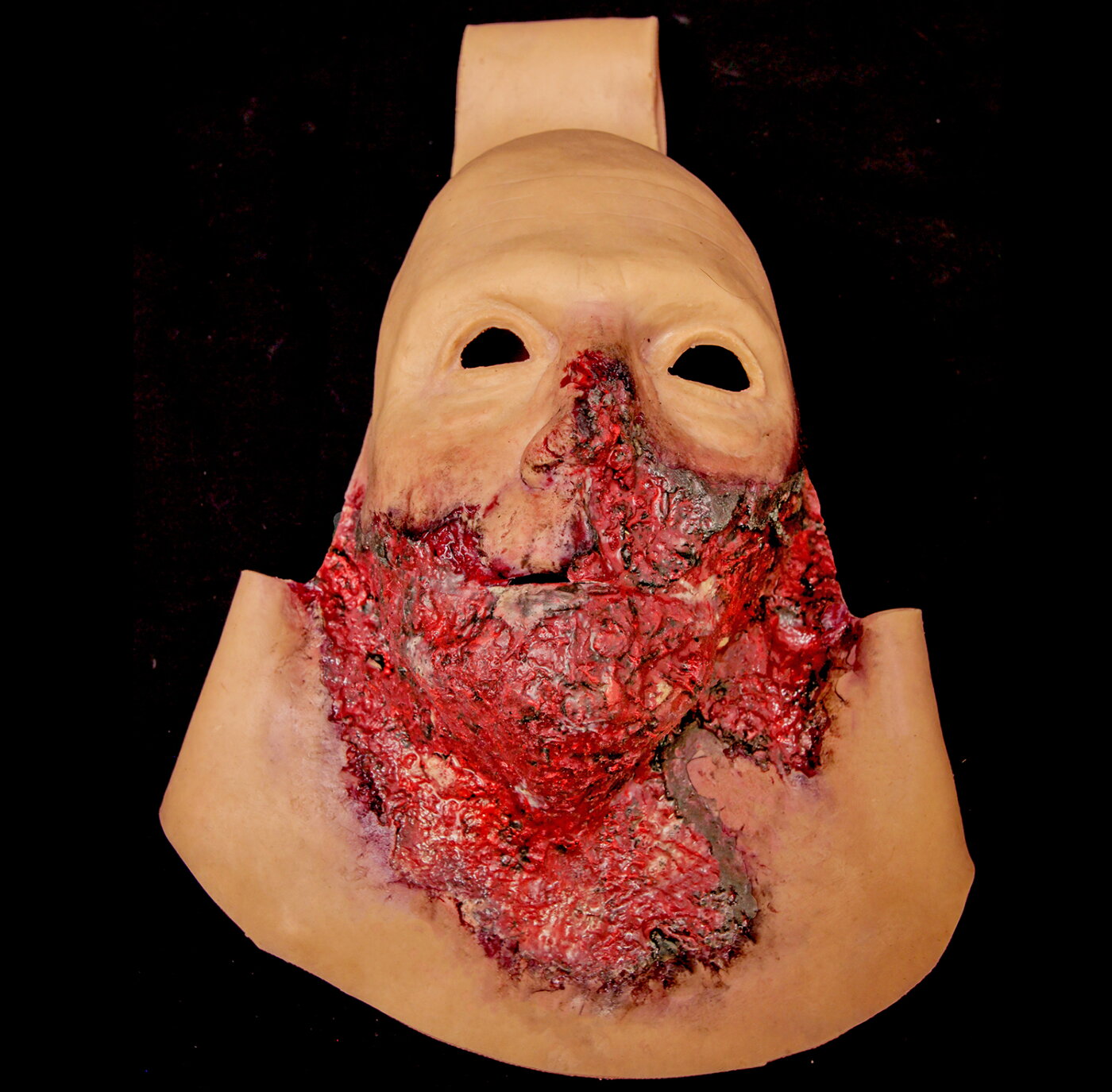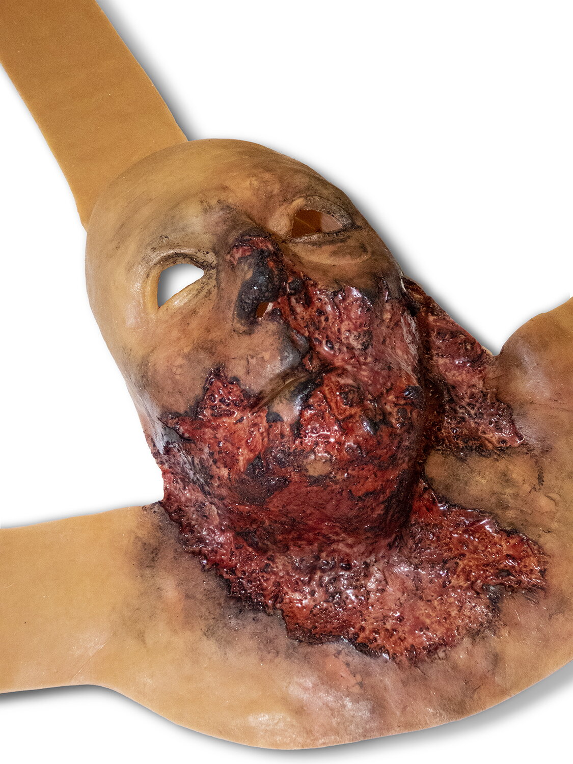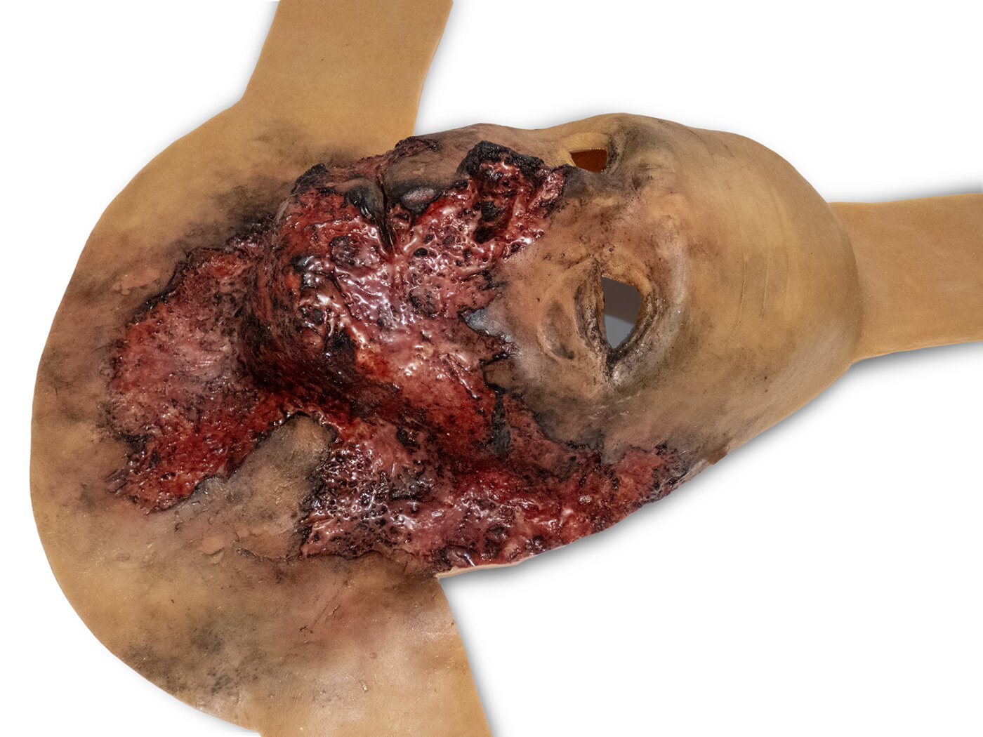 Pełna maska twarzowa symulująca oparzenia trzeciego stopnia, bez systemu krwawienia. Dzięki zapięciom na rzepy, symulacja może być szybko i bezpiecznie przymocowana do aktora lub manekina.