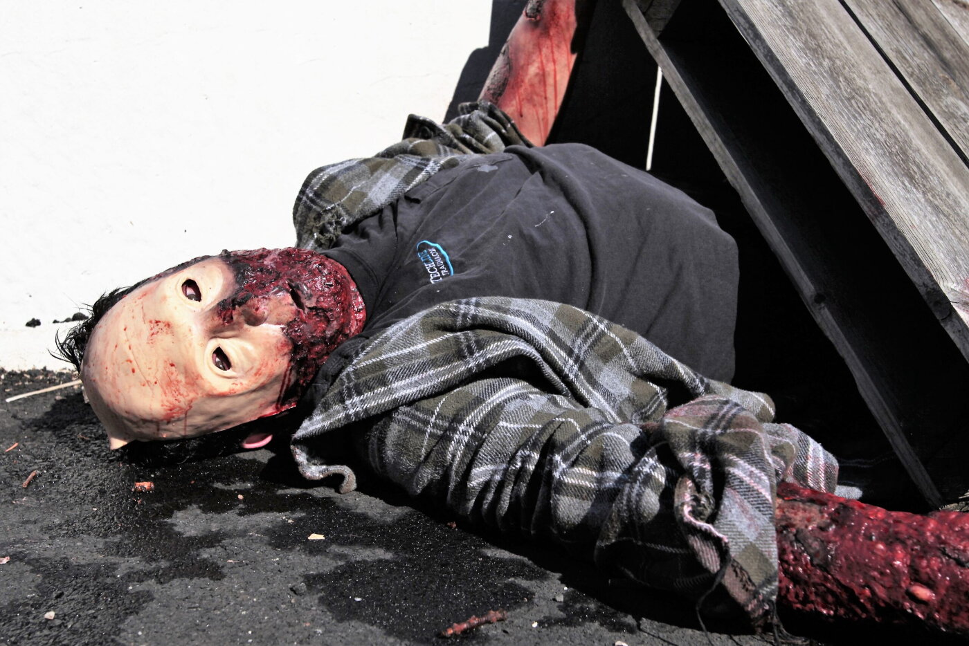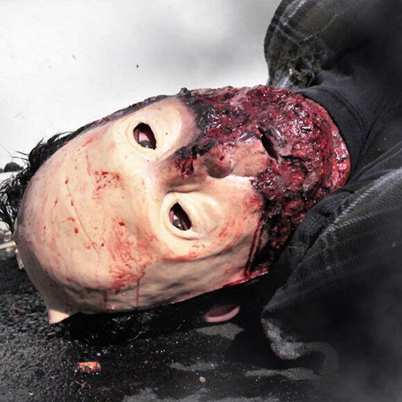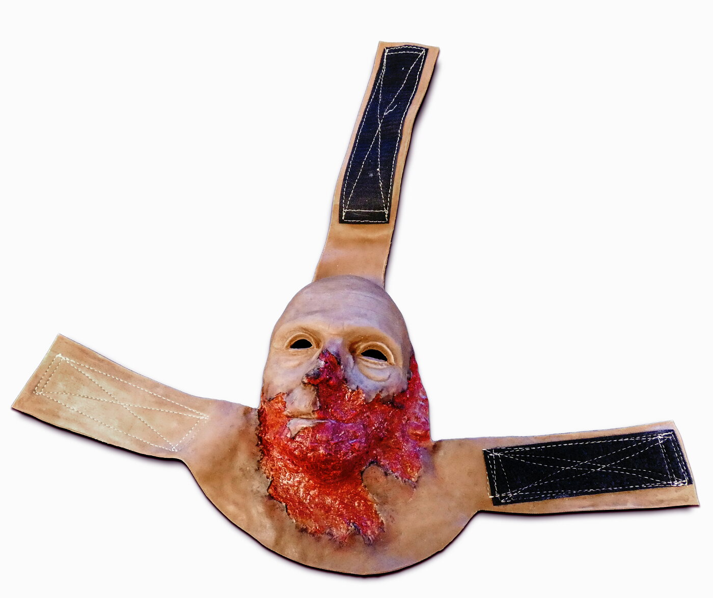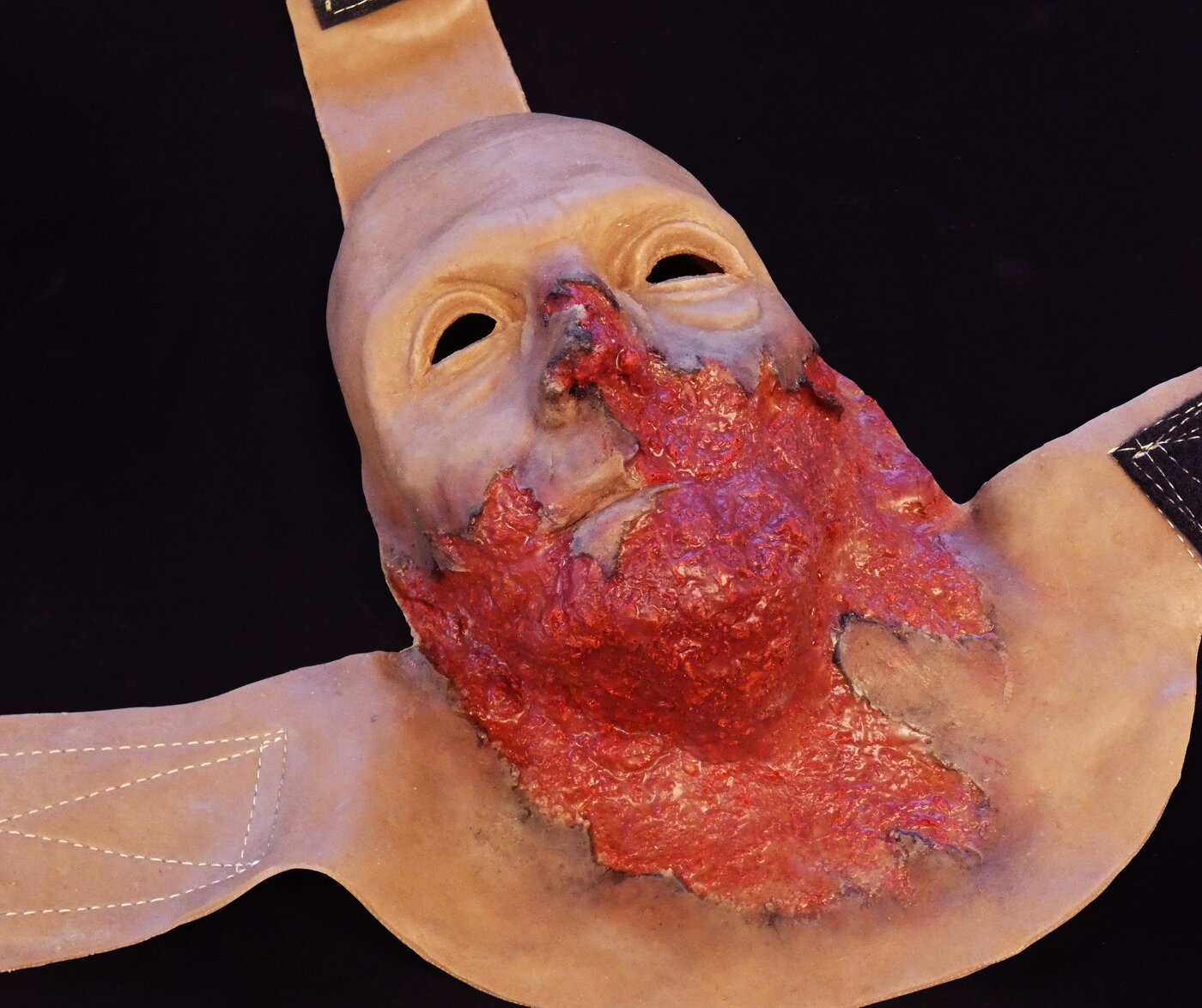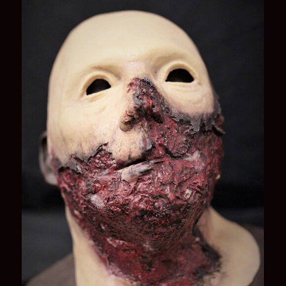 Pełna maska twarzowa symulująca oparzenia trzeciego stopnia, bez systemu krwawienia. Dzięki zapięciom na rzepy, symulacja może być szybko i bezpiecznie przymocowana do aktora lub manekina.