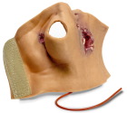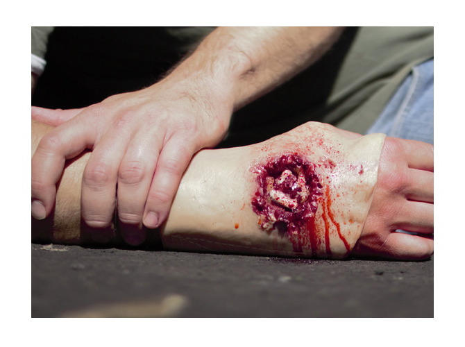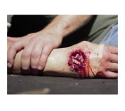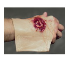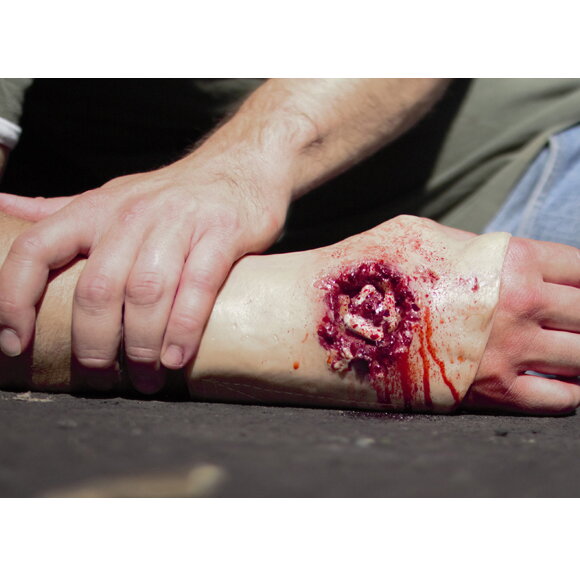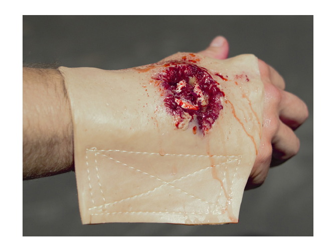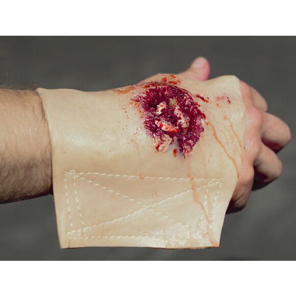 Symulacja rany postrzałowej dłoni prawej. Realistyczna rana, która odsłania tłuszcz, mięśnie, kości i ścięgna. Krwawienie występuje zarówno z rany wlotowej jak i wylotowej.