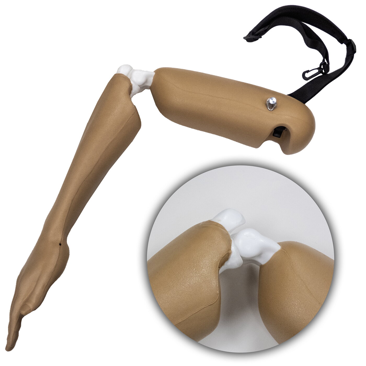 Anatomiczny trener do ćwiczenia różnych technik repozycji stawu łokciowego. Model ten charakteryzuje się anatomicznymi punktami orientacyjnymi, w tym dystalną częścią kości ramiennej, bliższą kością promieniową i kością łokciową, a także naturalnym oporem zwichniętego łokcia podczas próbowania technik repozycji.