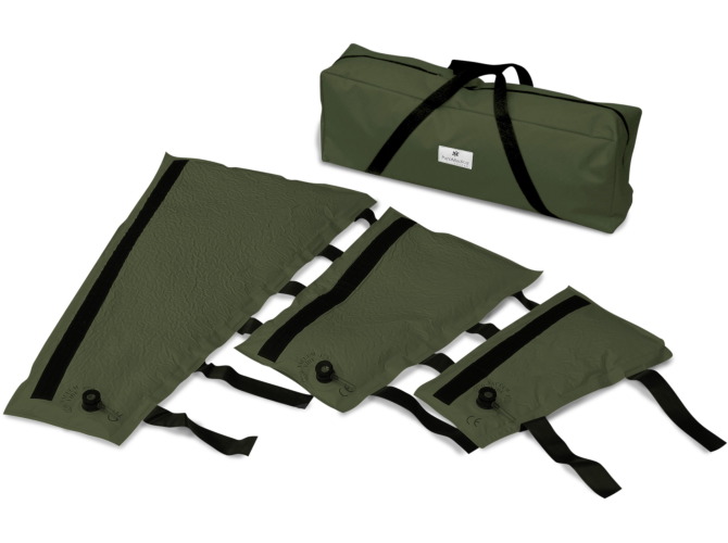 Oferowane z pompką, zestawem naprawczym i torbą transportową. Szyny dostępne są w kolorach: szarym, zielonym i pomarańczowym. Zapinane na rzepy.