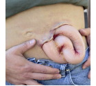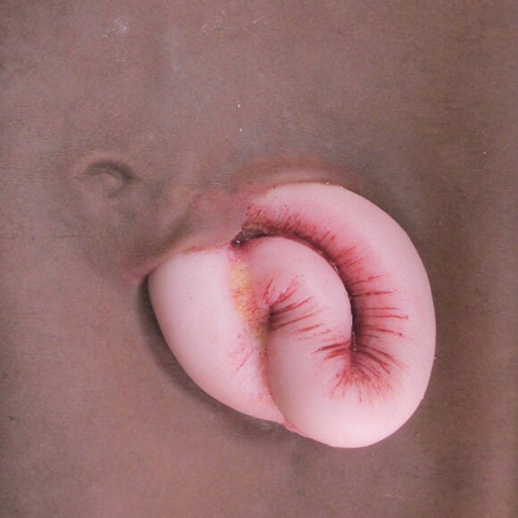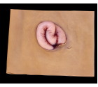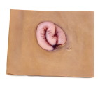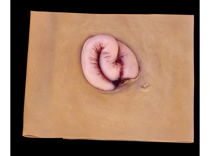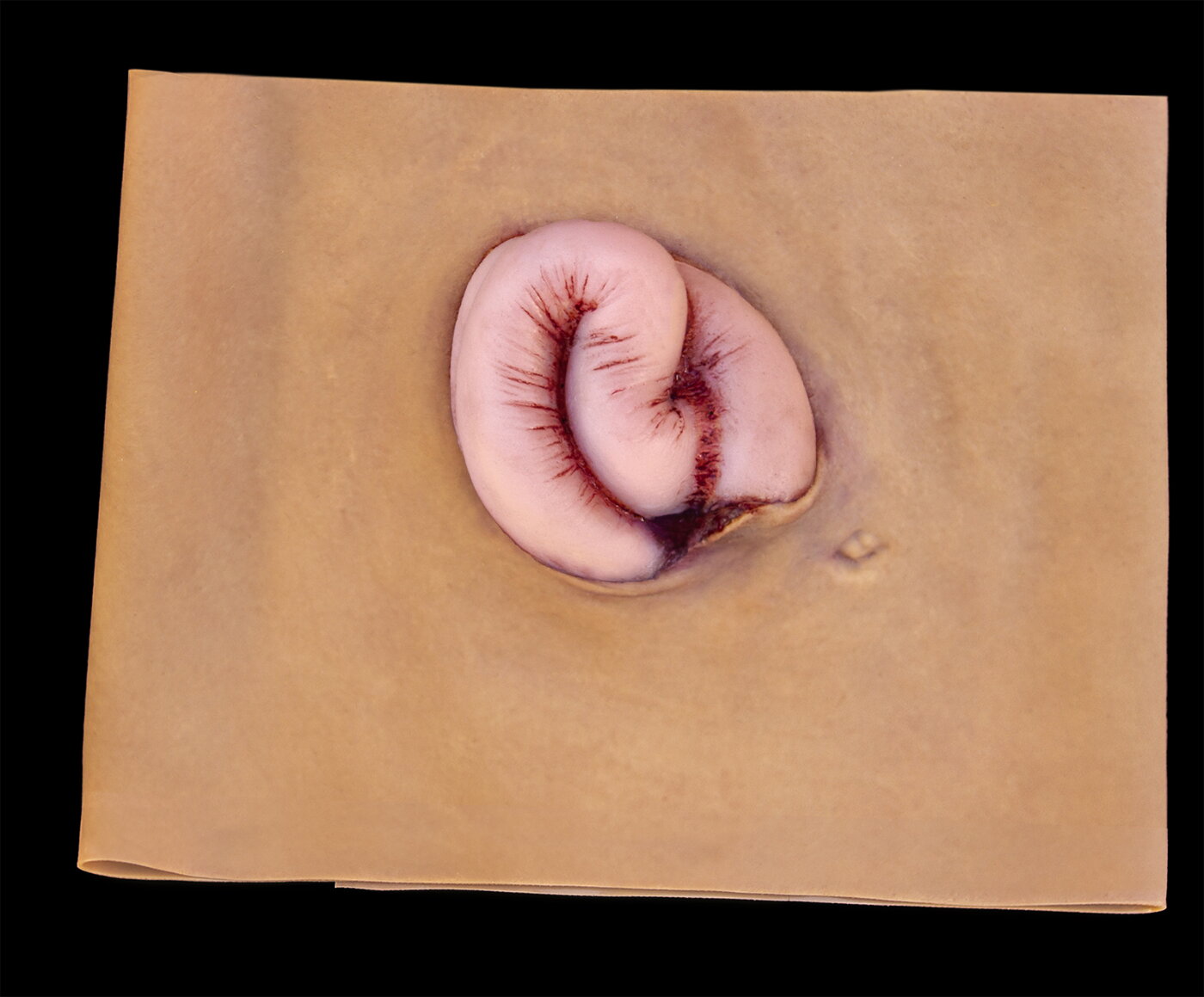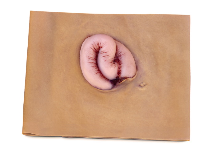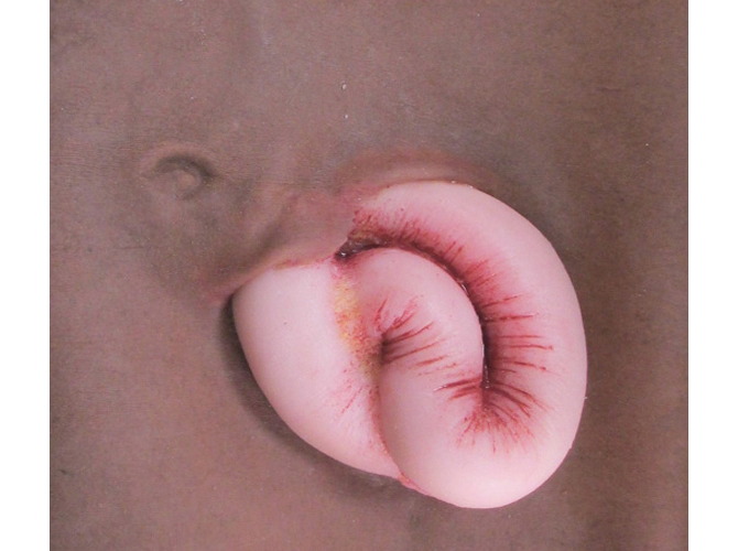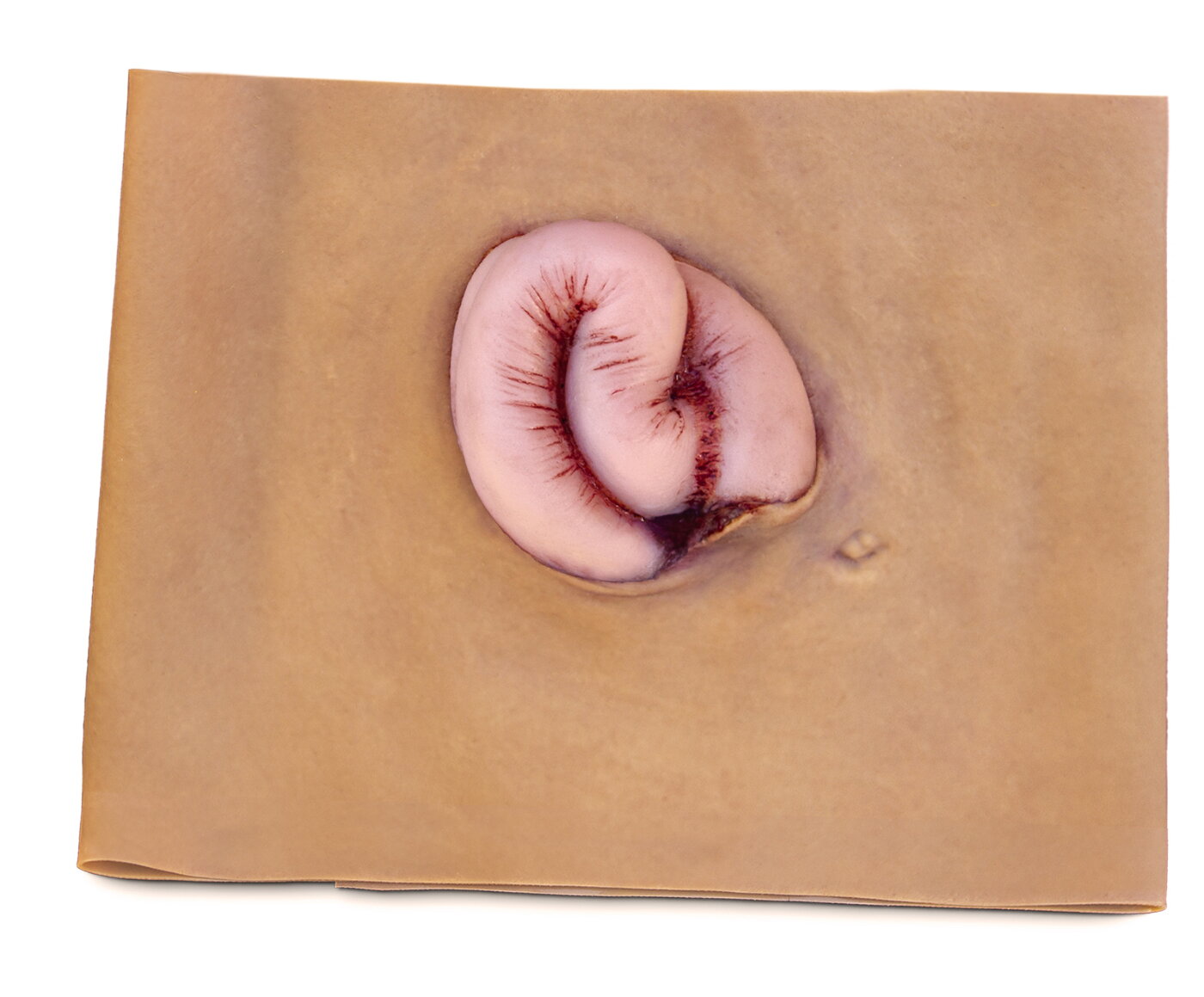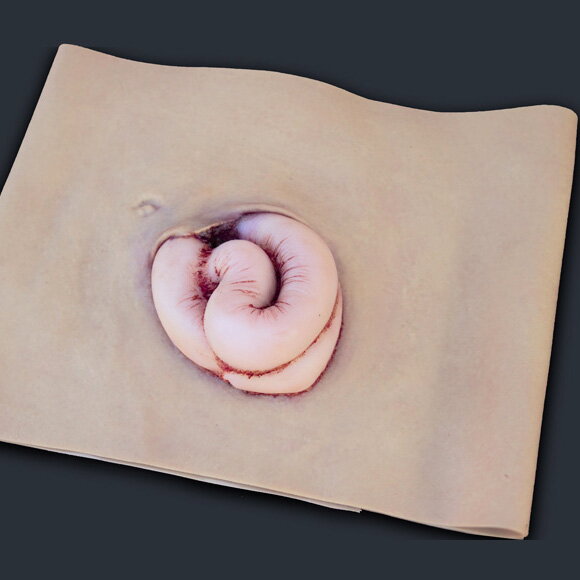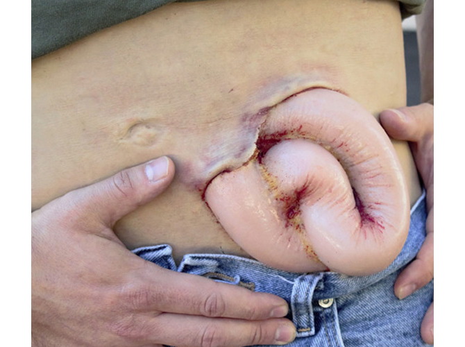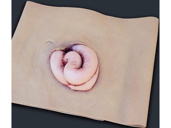 Model WW3-005 przedstawia głębokie rozcięcie brzucha z odsłoniętymi jelitami i tkanką tłuszczową.