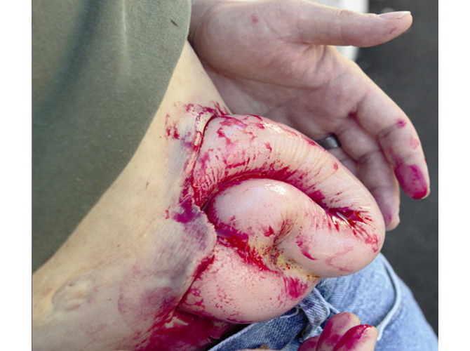 Zintegrowany system krwawienia pozwala na łatwe symulowanie przepływu krwi. Dzięki zapięciom na rzepy, symulacja może być szybko i bezpiecznie przymocowana do aktora lub manekina.