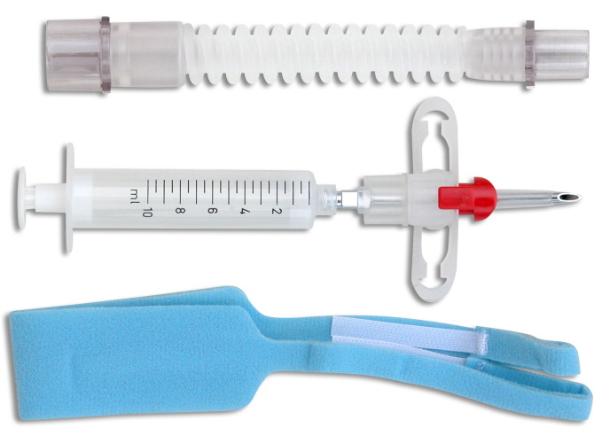 Najbardziej popularny zestaw do ratunkowej konikopunkcji. Zintegrowany dren z mandrynem o średnicy 4 mm, wyposażony w ogranicznik głębokości wkłucia. W zestawie także strzykawka i opaska do mocowania mandrynu po wykonaniu nakłucia. Całość spakowana w odpornym na uszkodzenia cylindrze.